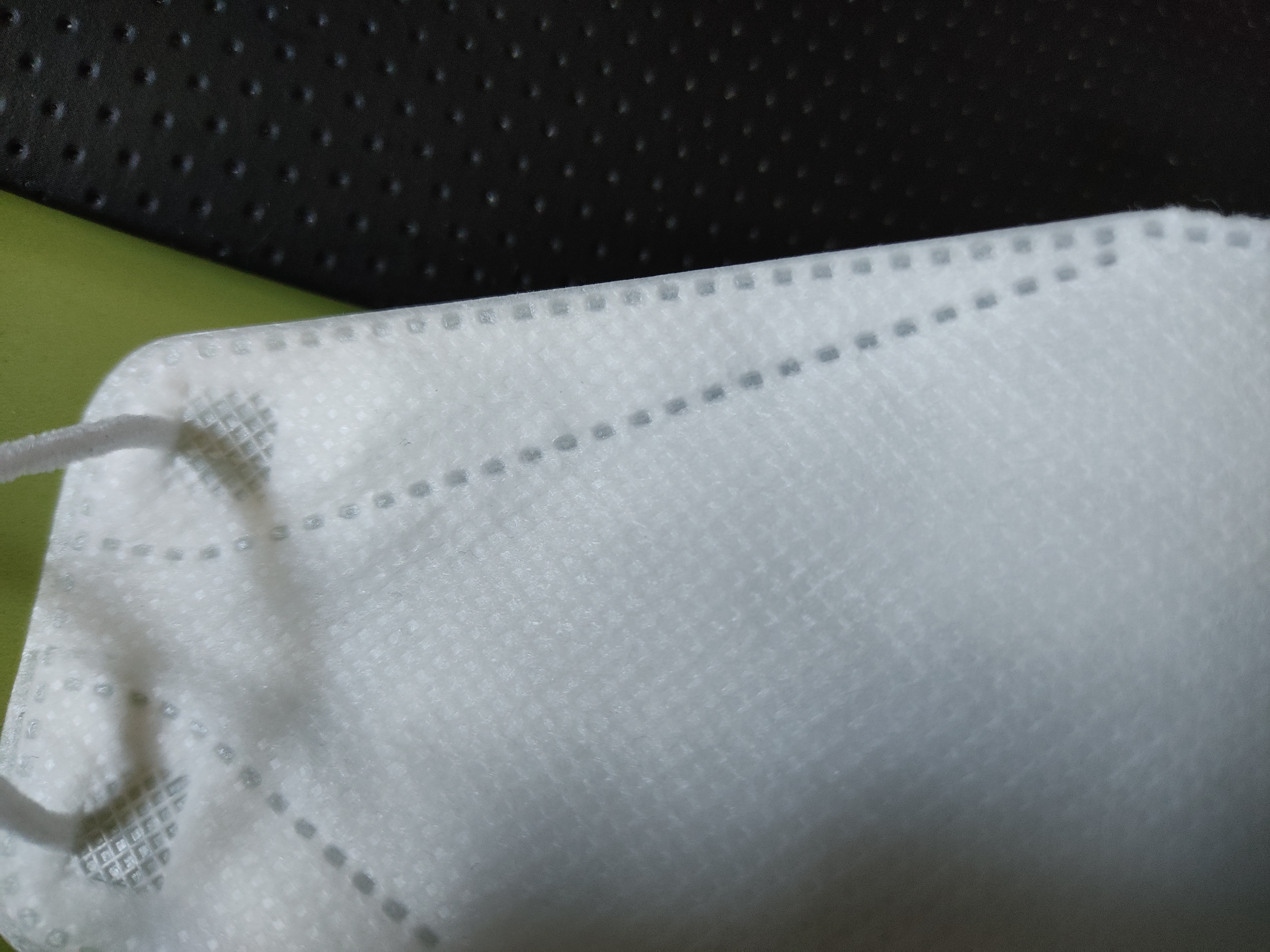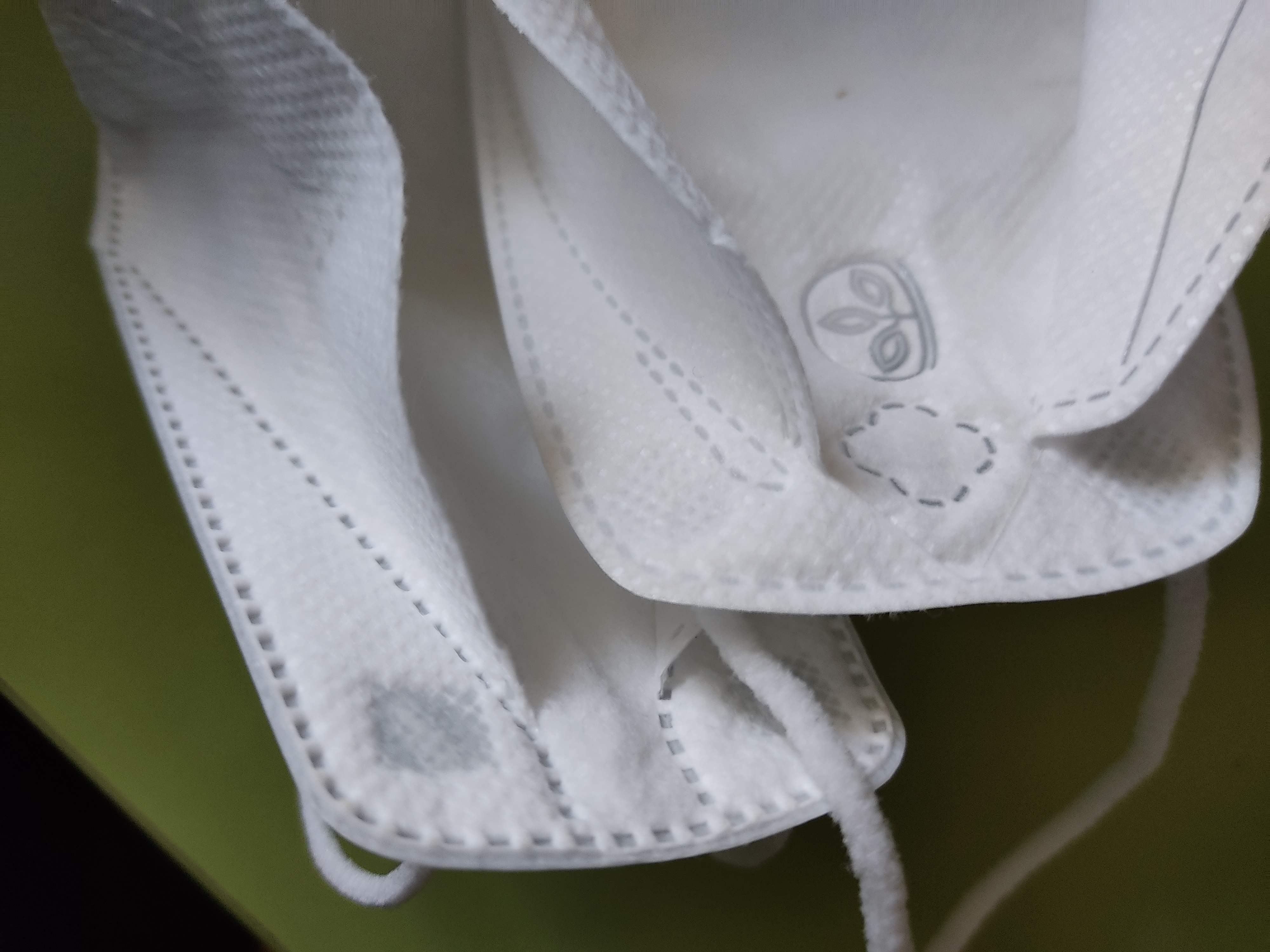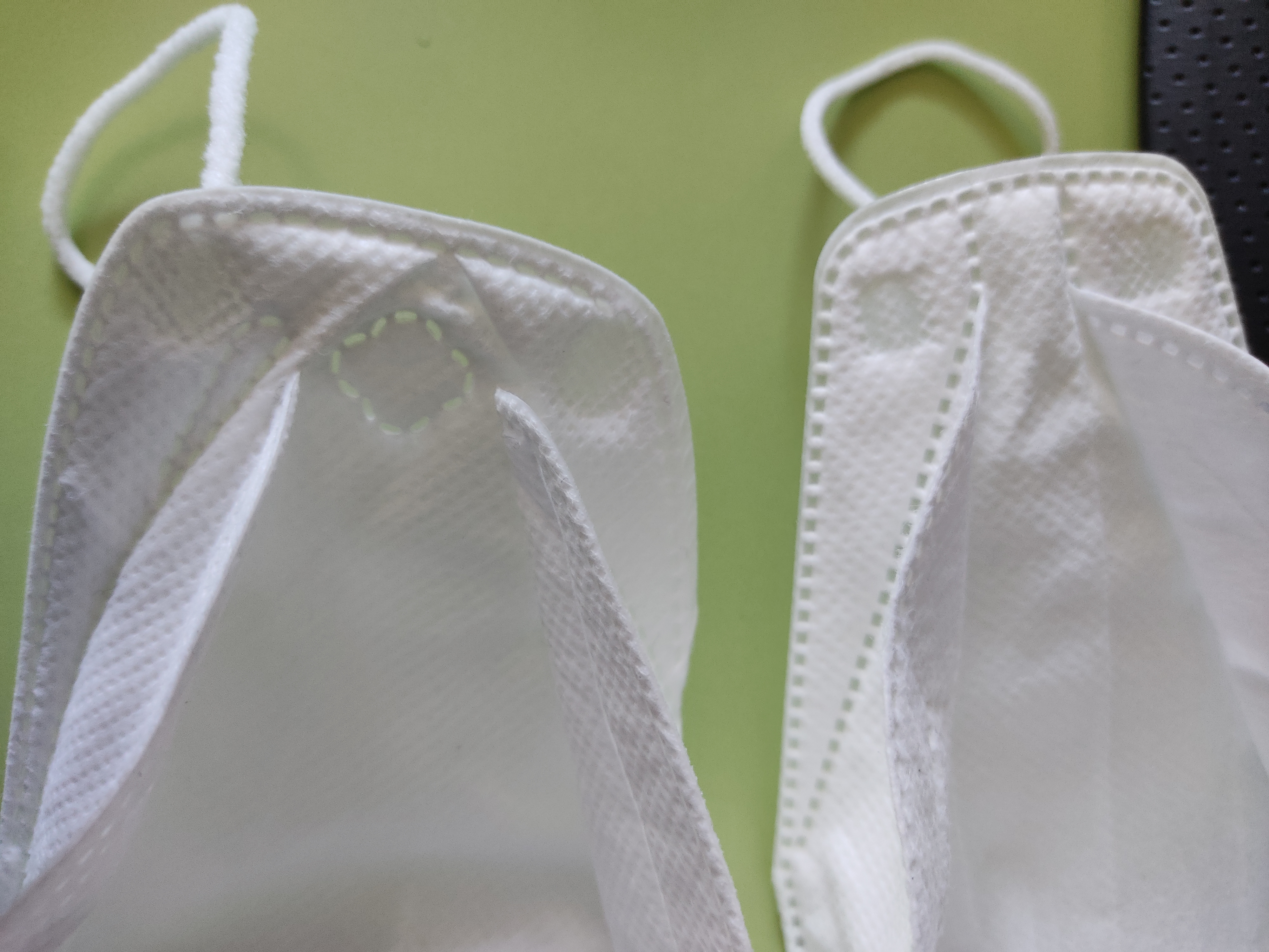 반면 우측 제품은 둥글게 봉제선이 안면에 잘 맞게 보이고 실제로도 착용감이 우수합니다. 마스크 모서리부분 처리도 사소하지만 차이가 분명해 보입니다.